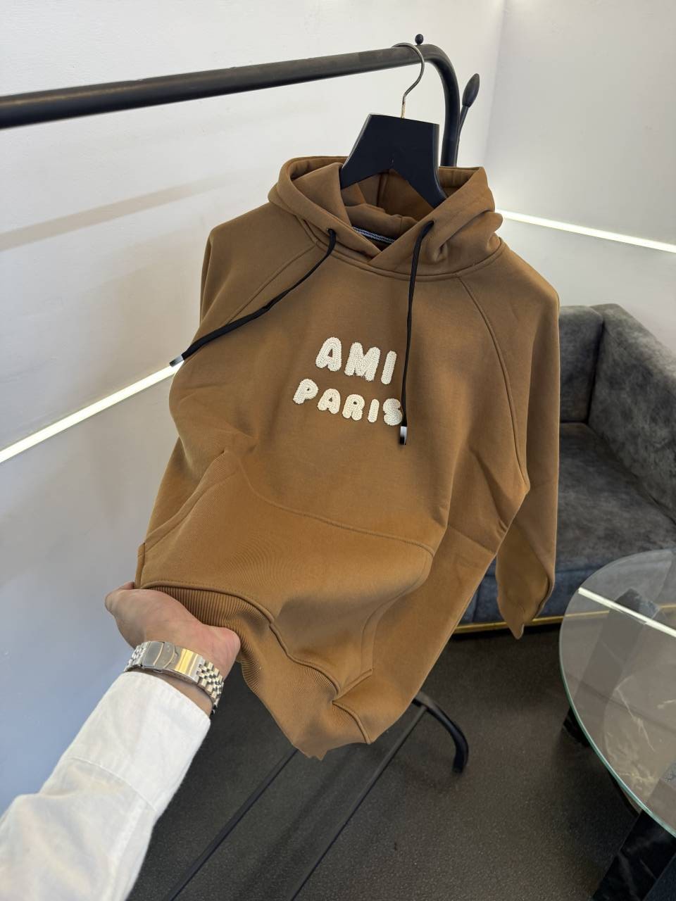 Ami paris oversize imported fleece hoodie with front embroidery branding brown